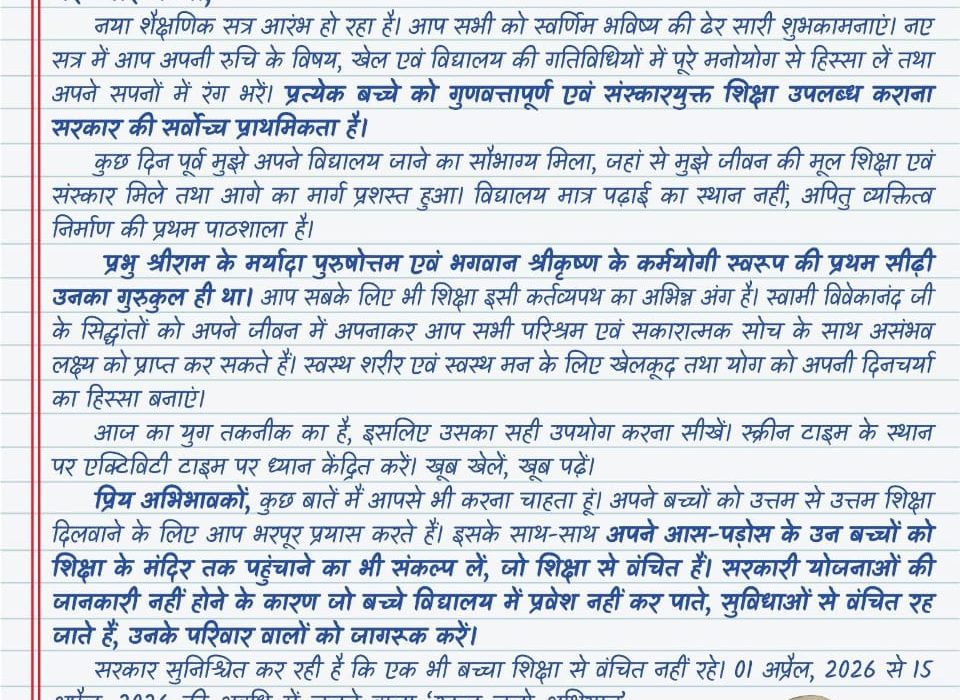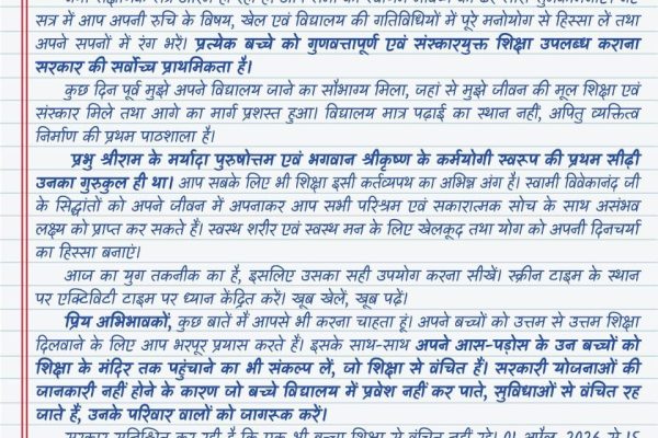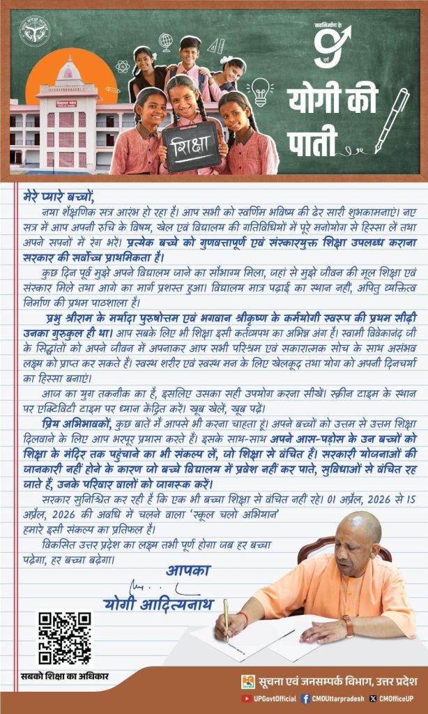 अपना उत्तर प्रदेशलखनऊ मेरे प्यारे बच्चों, योगी की पाती Vikram singh01/04/202601/04/20260 मेरे प्यारे बच्चों, नया शैक्षणिक सत्र आरंभ हो रहा है। आप सभी को स्वर्णिम भविष्य की ढेर सारी शुभकामनाएं। नए… Read More