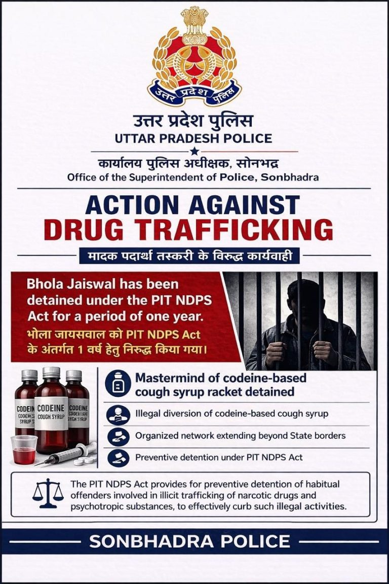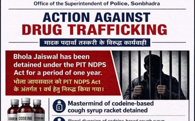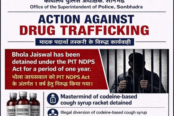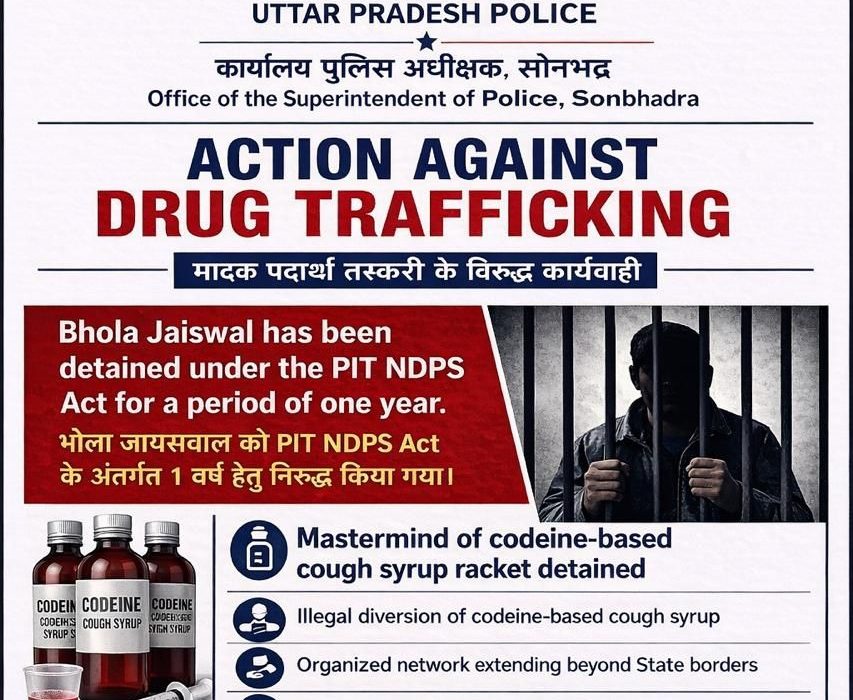 2कुख्यात कफ सिरप तस्कर शुभम जायसवाल के नेटवर्क पर बड़ा प्रहार: पिता भोला प्रसाद पिट एनडीपीएस एक्ट में 1 वर्ष के लिए निरुद्ध, सोनभद्र पुलिस के प्रस्ताव पर शासन की मुहर- Vikram singh19/04/2026