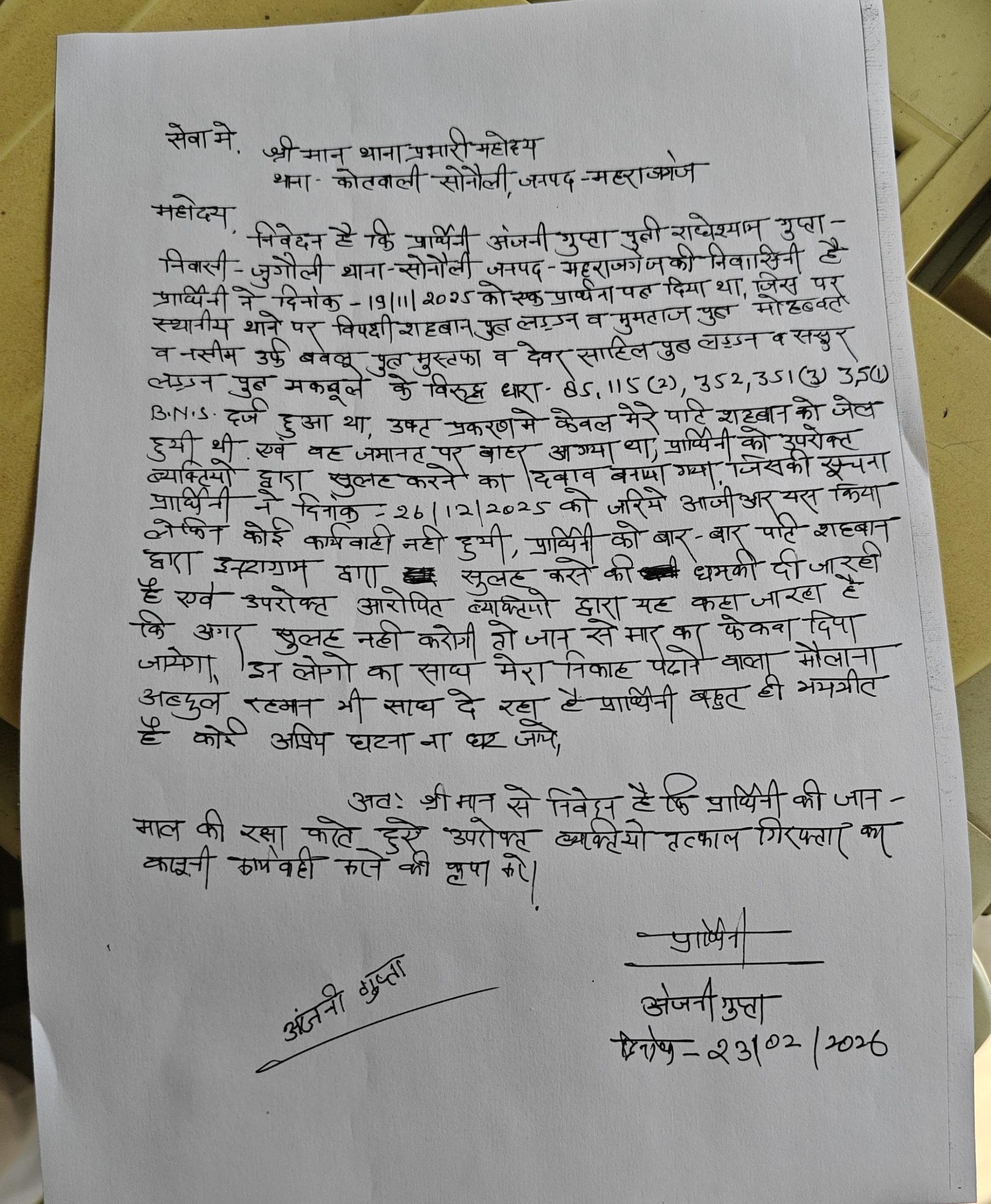 जुगौली निवासी अंजनी गुप्ता ने पुलिस को दी तहरीर में आरोप लगाया है कि उसके पति शहबान, मुमताज , नसीम उर्फ बबलू, साहिल, लड्डन तथा मौलाना अब्दुल रहमान लगातार उस पर सुलह-समझौते का दबाव बना रहे हैं। पीड़िता के अनुसार लव जिहाद से जुड़े मामले में पूर्व में मुकदमा दर्ज हुआ था, जिसमें उसके पति शहबान की गिरफ्तारी भी हुई थी और बाद में वह जमानत पर रिहा हो गया। आरोप है कि जमानत पर बाहर आने के बाद से ही वह और अन्य नामजद आरोपी उसे मुकदमा वापस लेने व समझौता करने के लिए धमका रहे हैं।