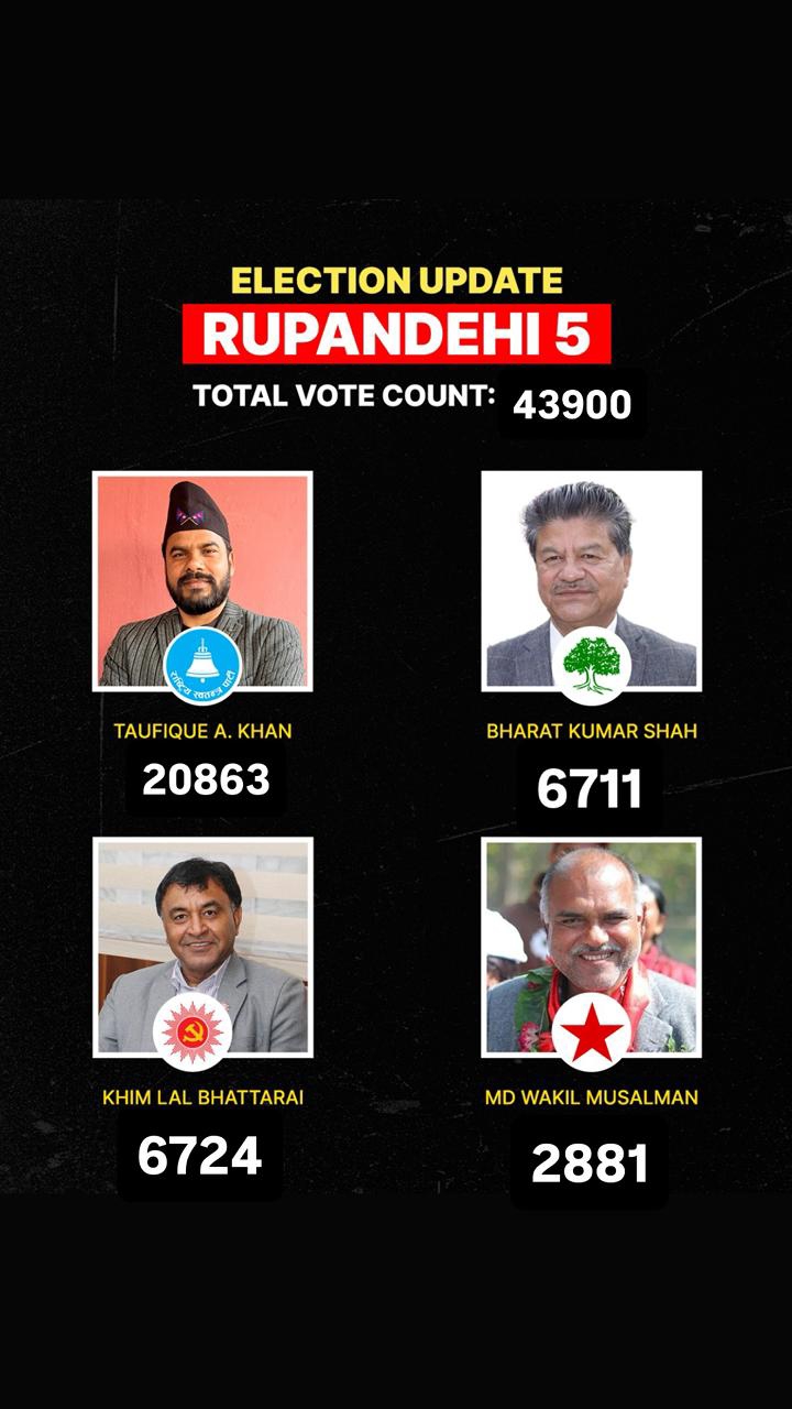 नेपाल खबररूपनदेही झेत्र नम्बर 5 से तौफीक की बढ़त बरकरार Vikram singh07/03/202607/03/202601 mins रूपनदेही झेत्र नम्बर 5 से तौफीक की बढ़त बरकरार तोफीक खाँ सुबह 10 बजे तक कि गिनती मे 20863 मत पाकर पहले स्थान पर बने हुए है. Post Views: 114 Post navigation Previous: सोनौली में विधायक ऋषि त्रिपाठी का हुआ जोरदार स्वागत, लोगो ने पुष्प की होली खेलीNext: नेपाल मे स्थिर सरकार बनने की उम्मीद जगी, बालेंद्र बन सकते है पीएम Leave a Reply Cancel replyYour email address will not be published. Required fields are marked *Comment * Name * Email * Website Save my name, email, and website in this browser for the next time I comment.