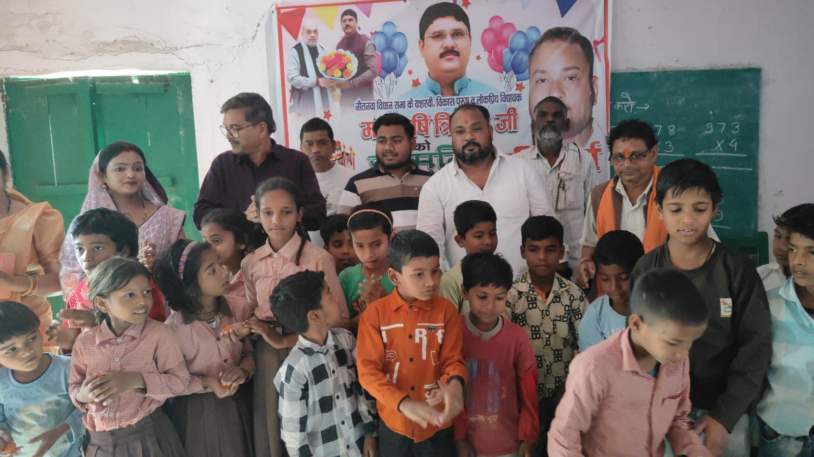 जानकारी देते चले कि, नौतनवा विधायक ऋषि त्रिपाठी के जन्म दिन के मौके पर बेहद ख़ास और कुछ अलग करने के क्रम मे नगर पंचायत सोनौली के विधायक प्रतिनिधि एव भाजपा नेता रवि वर्मा ने नगर me स्थित प्राथमिक पाठशाला पहुंच बच्चों के साथ केक काट कर विधायक का जन्म दिन मनाया, वही बच्चों को उपहार स्वरुप कॉपी और पेन्सिल दिया।